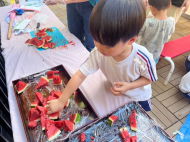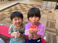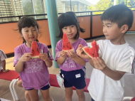 みんなで協力して割ったスイカ、甘くてとっても美味しかったね