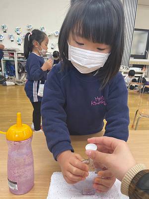 液がこぼれないように支えてくれたり、緑組さんは自分で液入れに挑戦!!