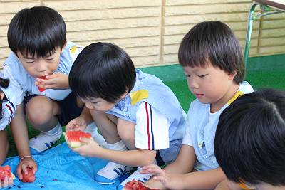 みんなで力を合わせて上手にすいかを割ることが出来ました(o^―^o)