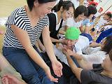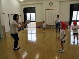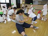 一緒に準備体操をした後は、新聞紙を丸めたボールを転がしたり、キャッチボールをしたりしました!
