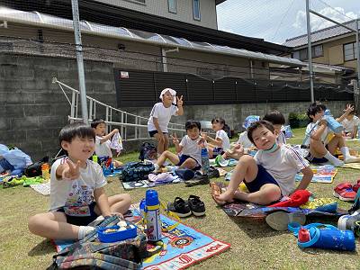 幼稚園に帰ってきたら芝生でお昼ご飯