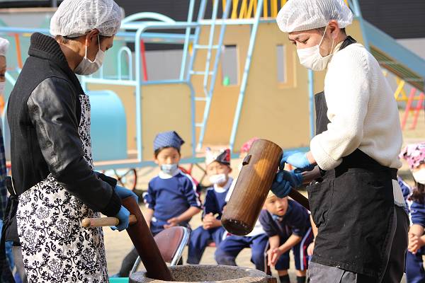 たくさんのお父さんやお母さんにもお手伝いいただき、園庭でおもちつきを行いましたよ!