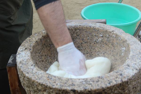 最初は園長先生やお父さんたちがお米をつぶすところから