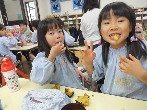先週はみんなでお芋ほり、大根抜き、柿狩りにでかけましたが、今日はそのお芋や大根を使って母の会のお母さんたちがお芋パーティを開催してくださいました☆