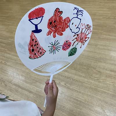お顔を書いたりと自由にお絵かきもしました!かわいいうちわが出来上がったね!