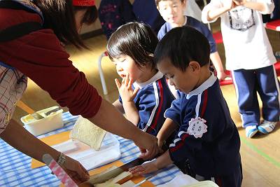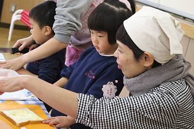 今日は卒園児のパン屋さんをお招きし、桜組のみんなでラスクづくりをしました!