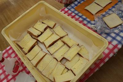 バターを塗ってお砂糖を付けた後半分に切るんだって!上手にできるかな?
