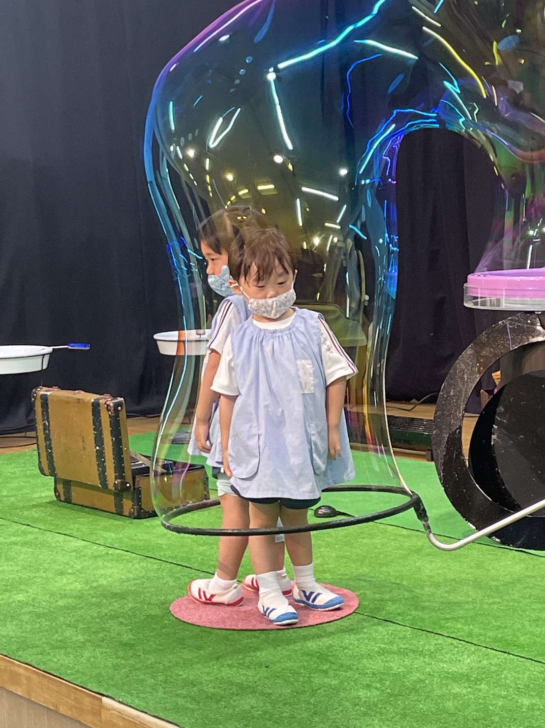 今日は講堂にシャボン玉ショーがやって来ましたよ みんなの身体より大きなシャボン玉や、シャボン玉の中にまたシャボン玉が入っていたり、触っても割れないものも登場!