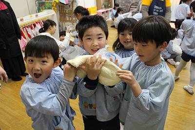 前日に小麦粉、水、塩を混ぜてみんなで生地を作りました