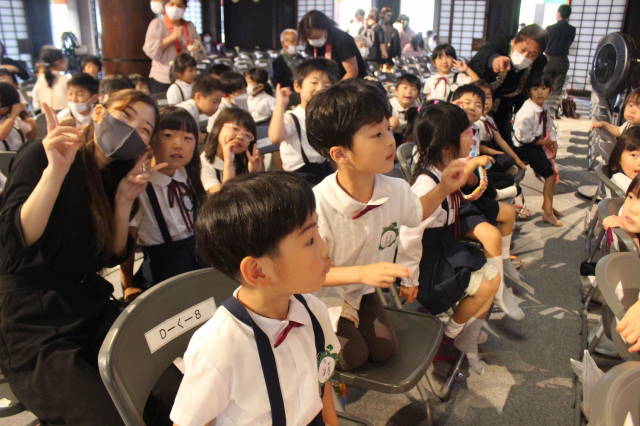 西本願寺の御影堂で、他の幼稚園のお友達と一緒におつとめをしたり、お話を聞きました。