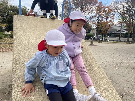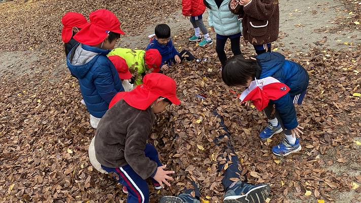 清々しい秋晴れの中、幼稚園のお友達みんなで皇子山公園に落ち葉拾いに行ってきました