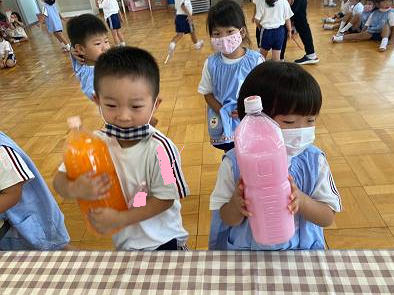きれいな色水が完成し、みんなお気に入りの色水が出来たみたいです![]()