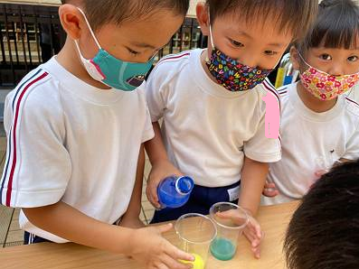 赤、青、白、黄色の色水を混ぜてみんな色んなジュースを作っていました![]()