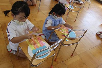 今日はサマースクール2日目!各学年に分かれて夏の製作「うちわ」を作りました