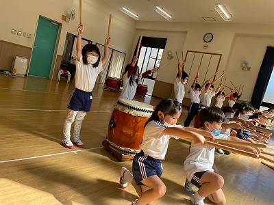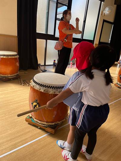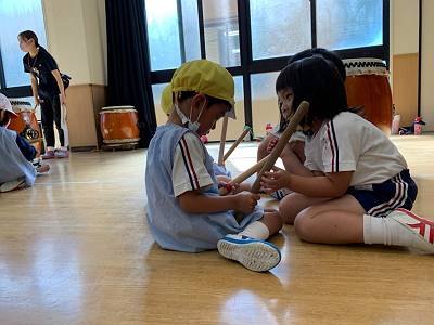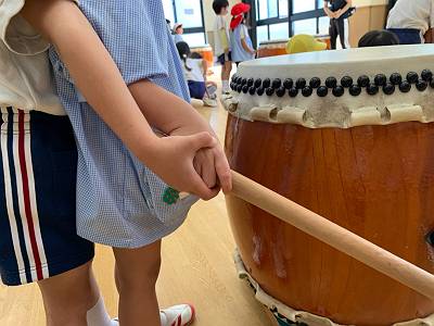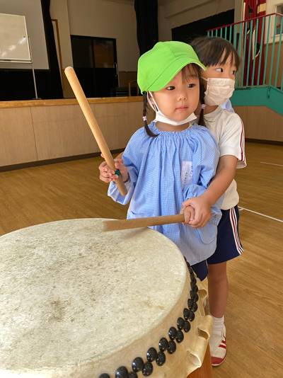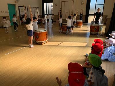 幼稚園中に和太鼓の大きな音が響き渡ります
