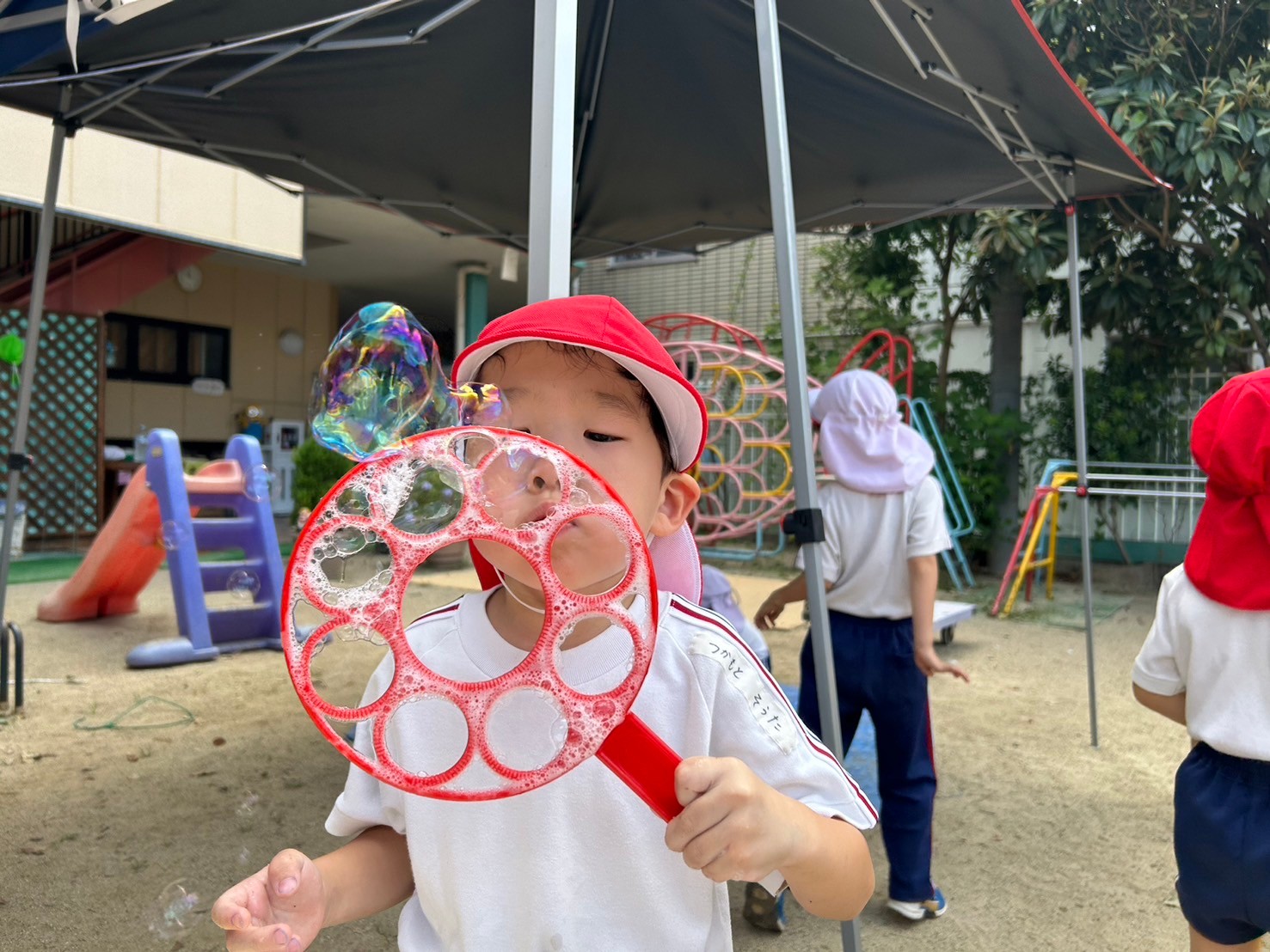 お外では大きなしゃぼん玉を作っているお友達がたくさん!