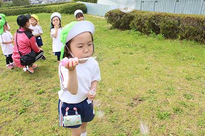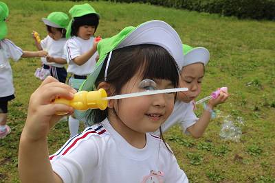 気持ちのいい青空の中に、シャボン玉と子どもたちの笑顔が輝いていました