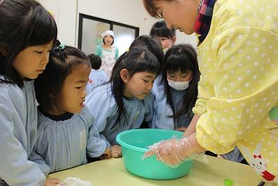 前日に小麦粉、水、塩を混ぜてみんなで生地を作りました