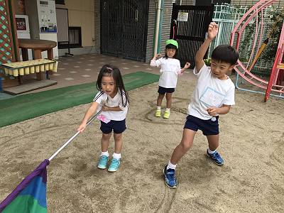 黄組さん、お友だちに当たらないように桜組さんを