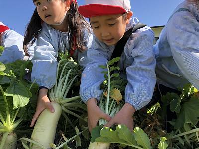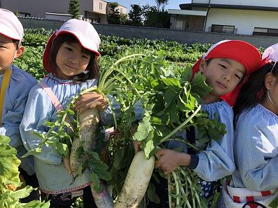 みんなの体が隠れるくらい大きな大根をゲットしました!