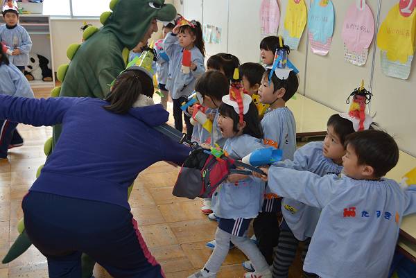 声をそろえて大きな声でおにを追い払います