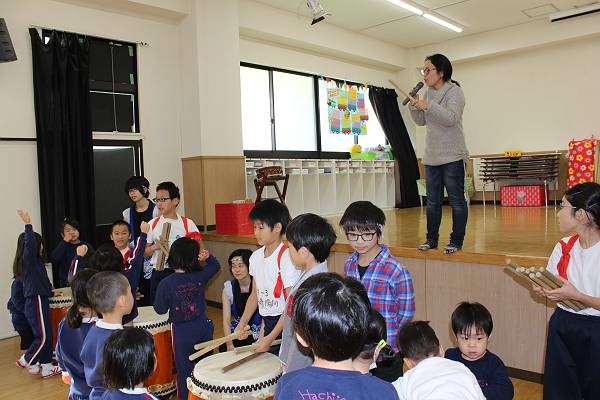 今日はこしば先生から和太鼓についていろいろ教えていただけるということで、まだ和太鼓でほとんど遊んだことのない桜組さんはどきどき、黄・緑組さんは久しぶりの和太鼓をとっても楽しみにしていました