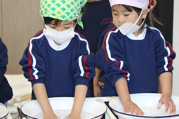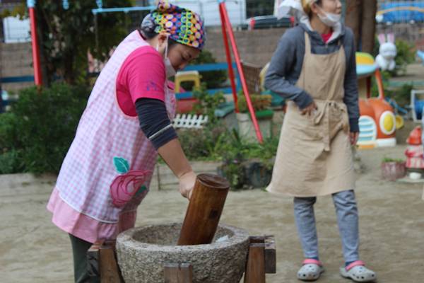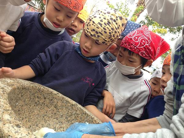 最初は園長先生やお父さんたちがお米をつぶすところから