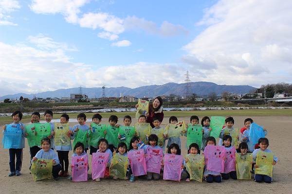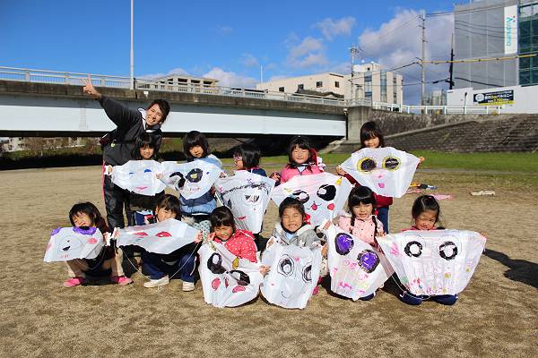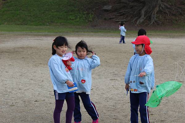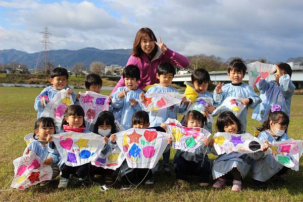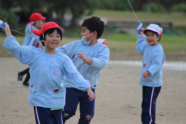 桜組さんと緑組さんは幼稚園で作った凧をもってみんなでたこあげに出かけましたよ