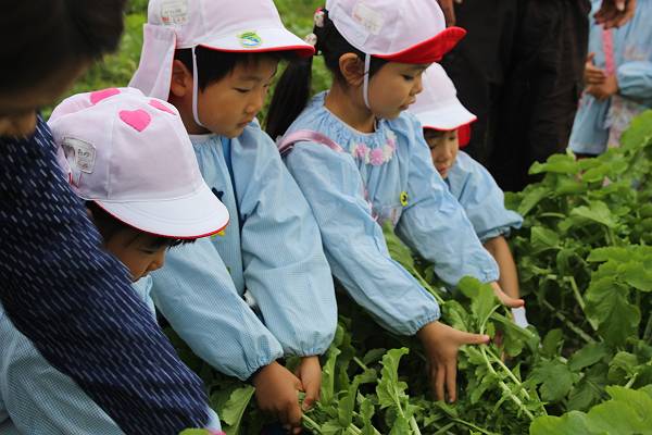 自分の背丈くらいある大根の葉っぱに囲まれ、かくれちゃいそうな桜組さん。