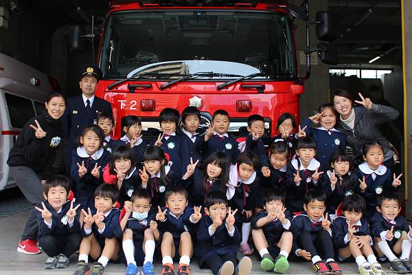 11月23日は勤労感謝の日。そこで緑組さんはいつもみんなが楽しく、平和に生活できていることを感謝する意味も込めて、消防署と交番を訪問してみんなで御礼を言いにいきました☆