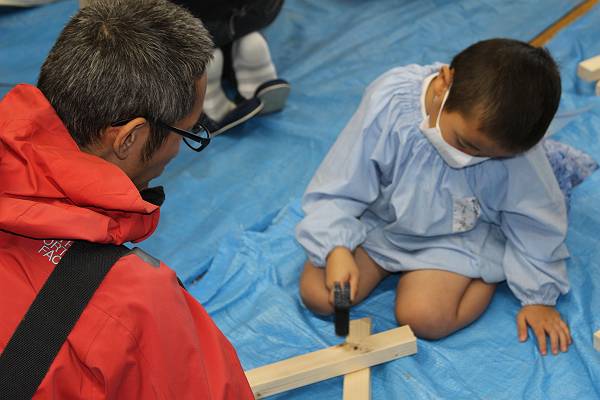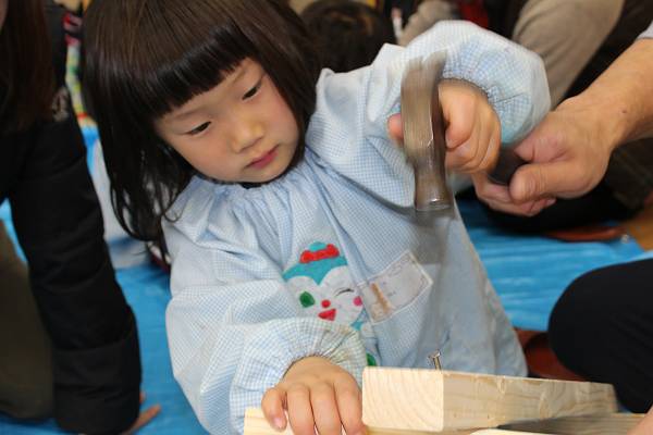 木がきれたら次は金づちをつかってつなげます