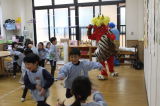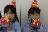 みんなで作ったお面や豆入れをつけて準備は万端!