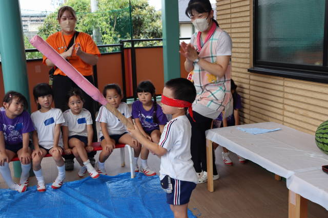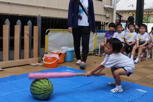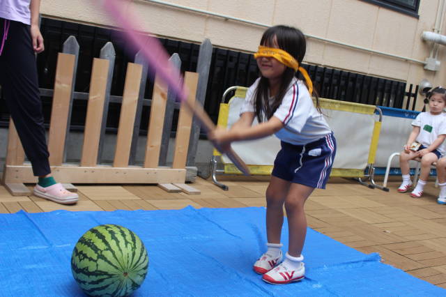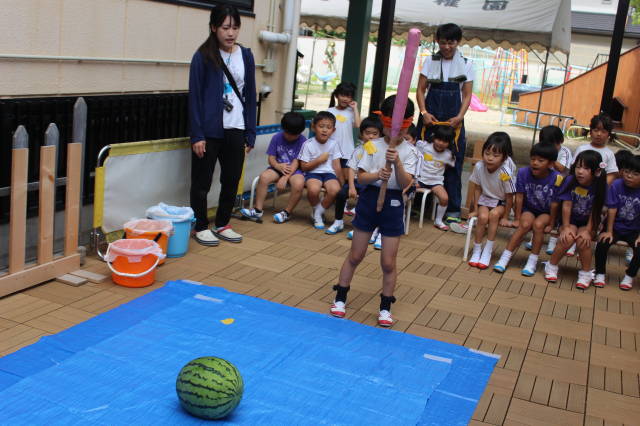 りんご、めろん、ばなな、ぶどうの4グループにわかれて、早速すいか割り開始です!