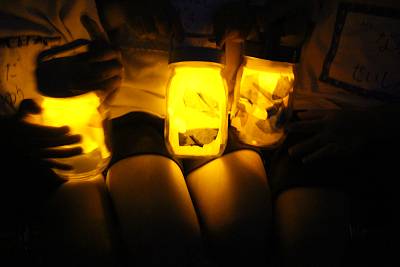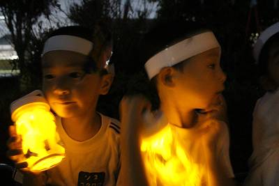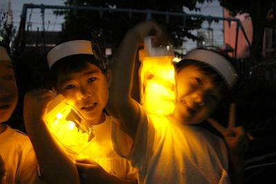みんなが作った手作りのお面と灯篭を持って