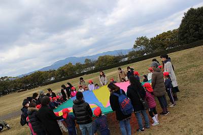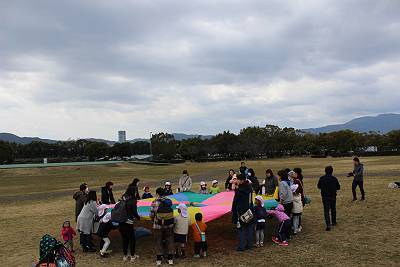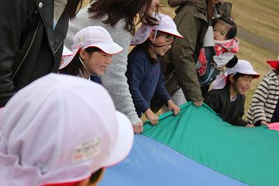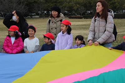 親子でバルーンを持って広げたり音楽に合わせて踊ったり
