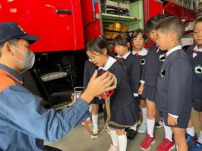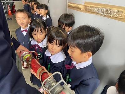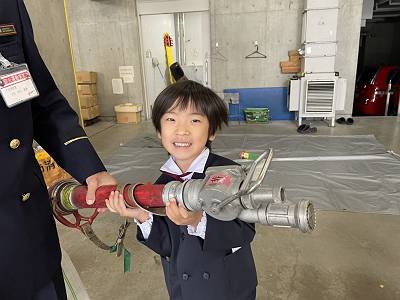 たくさん消防車の勉強をした後は実際にホースをもったり、車に乗せてもらえましたよ