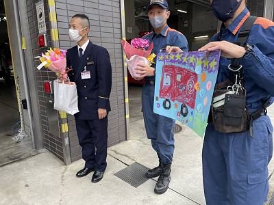 いつもみんなを守ってくれているお礼を伝えて、手作りのプレゼントと花束を渡しました