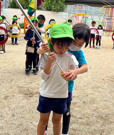 」とよろける黄組さんでしたが、緑組さんが一緒に持ちながら踊っていました![]()