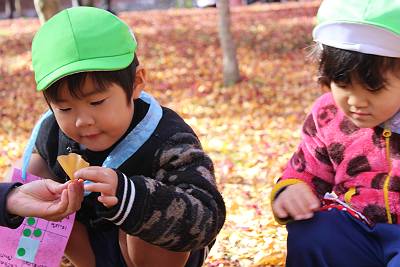 今日はとっても良いお天気の中、みんなで落ち葉拾いに行って来ました!