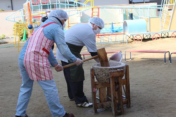 たくさんのお父さんやお母さんにもお手伝いいただき、園庭でおもちつきを行いましたよ!