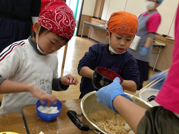 最初は園長先生やお父さんたちがお米をつぶすところから