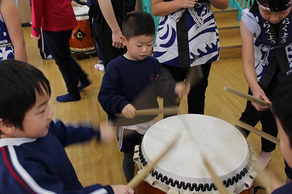 今日はこしば先生から和太鼓についていろいろ教えていただけるということで、まだ和太鼓でほとんど遊んだことのない桜組さんはどきどき、黄・緑組さんは久しぶりの和太鼓をとっても楽しみにしていました