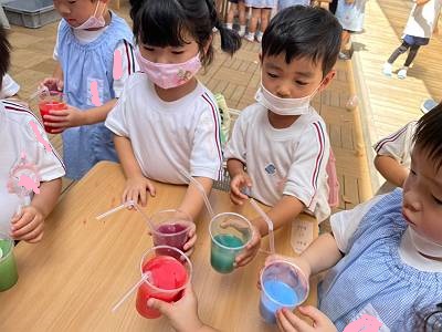 赤、青、白、黄色の色水を混ぜてみんな色んなジュースを作っていました![]()