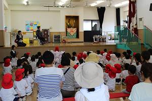 幼稚園ではまずみんなで講堂に集まり、あさのお入りをしました。