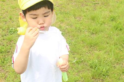 気持ちのいい青空の中に、シャボン玉と子どもたちの笑顔が輝いていました