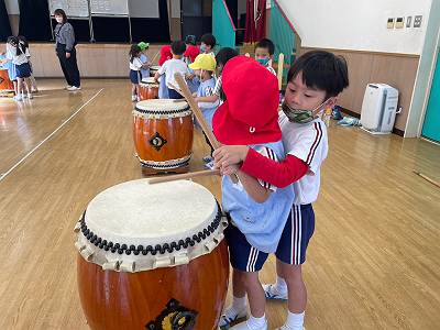 幼稚園中に和太鼓の大きな音が響き渡ります