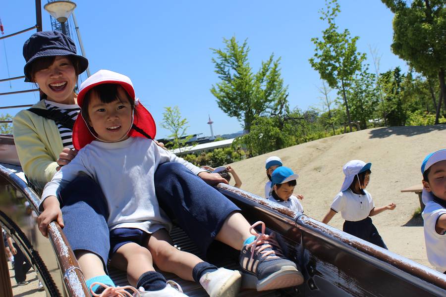 先生と一緒に滑り台をビューン