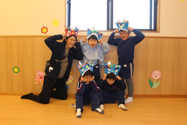 みんなで作ったオリジナルのお面と豆入れで記念撮影