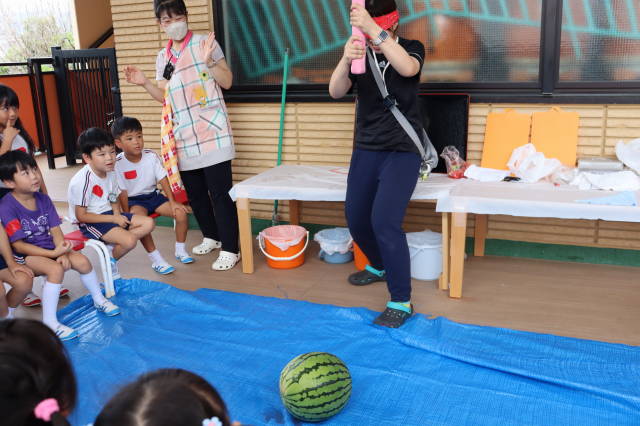 りんご、めろん、ばなな、ぶどうの4グループにわかれて、早速すいか割り開始です!