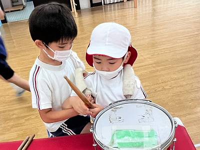 今日は黄組さんと緑組さんで鼓笛隊遊びをしました![]()